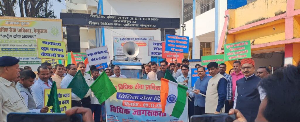 राष्ट्रीय विधिक सेवा प्राधिकरण दिवस के अवसर पर रविवार को बेगूसराय जिला विधिक सेवा प्राधिकरण (डीएलएसए) की ओर से एक भव्य विधिक जागरूकता रैली निकाली गई। रैली का उद्देश्य समाज के अंतिम व्यक्ति तक न्याय की जानकारी और सहायता पहुँचाना था। रैली की शुरुआत एडीआर भवन से हुई जो राजकीय रामकुमारी अयोध्या लॉ कॉलेज तक पहुँची। इस दौरान प्रतिभागियों ने “न्याय सबके लिए – समान अवसर हर किसी को” और “लोक अदालत से समाधान – समय, धन और श्रम की बचत” जैसे नारे लगाए।