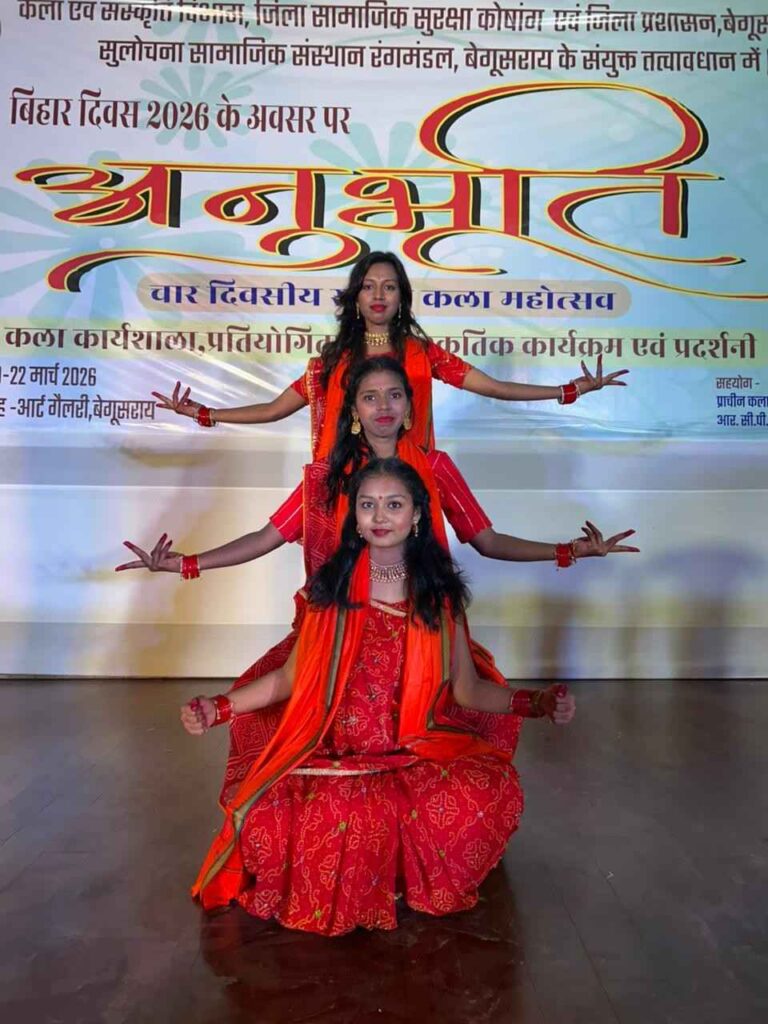 🎭 बेगूसराय के कंकौल स्थित प्रेक्षागृह में आयोजित चार दिवसीय राष्ट्रीय कला महोत्सव “अनुभूति” के तीसरे दिन सांस्कृतिक और कलात्मक प्रस्तुतियों का भव्य आयोजन हुआ। इस महोत्सव का आयोजन जिला प्रशासन, कला एवं संस्कृति विभाग, जिला सामाजिक सुरक्षा कोषांग तथा सुलोचना सामाजिक संस्थान (रंग मंडल) के संयुक्त तत्वावधान में किया गया। कार्यक्रम के सफल संचालन में प्राचीन कला केंद्र, चंडीगढ़ और आरआरसीपीएसएम आर्ट एंड क्राफ्ट कॉलेज का महत्वपूर्ण योगदान रहा।
